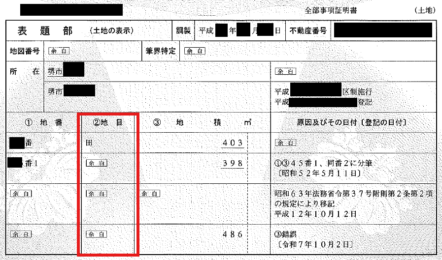 上記の登記簿の「地目」は「田」(=農地)になってます。ので、この不動産は農地転用許可の対象の土地になることがわかります。
